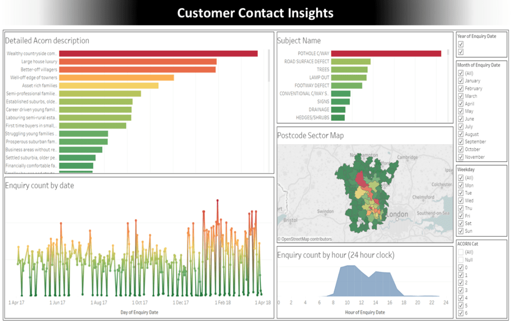 An interactive dashboard I created using customer contact data from a call centre. The goal of this project was to enable call centre managers to analyse insights regarding the geographic locations of customers making calls, as well as to gather additional information about their household segmentation profiles, types of inquiries, and call volume by day and time. This tool provided a comprehensive overview of the inquiries made by different demographic groups and helped shape a strategy to shift more customer support online. This encouraged customers to self-serve and also helped inform automated chatbot routing processes.
