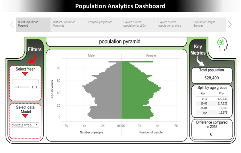 I developed a dashboard to showcase and enhance the Office for National Statistics (ONS) small area population data (output areas) for a local authority. The objective was to gain deep insights into the county’s changing population, driven by an aggressive housing development strategy. To achieve this, I used standard ONS data to create a customised population forecast for the next 15 years for each Lower Layer Super Output Area (LSOA) and electoral ward. This forecast was informed by detailed housing trajectory data gathered on a site-by-site basis, linked to the authority’s adopted local plan. I then developed a suite of dashboards that allowed users across the authority to interact spatially with the data. This tool significantly impacted planning for future service delivery and helped to understand the changing demographics of communities, influenced by natural population changes, migration, and housing developments.