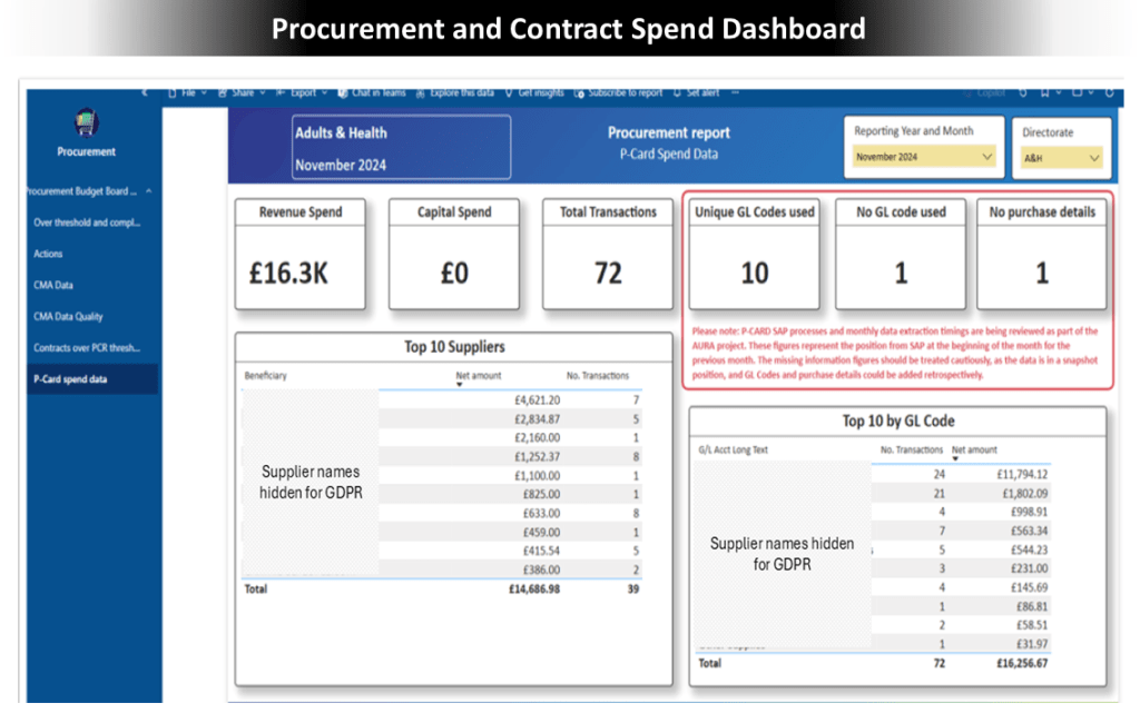 I developed this dashboard to support the commissioning and procurement department of a large organisation. The department faced challenges due to relying on two central systems, as well as several spreadsheets and processes, to manually produce reporting packs for the directorate and corporate management teams each month. This manual reporting process took two weeks per month to complete. It was susceptible to human error and single points of failure, particularly when specific staff members were on annual leave or absent due to illness. To address these issues, the dashboard and associated data integration process were designed to consolidate datasets and automate reporting. The project also included training and a handover of the product to the department staff.