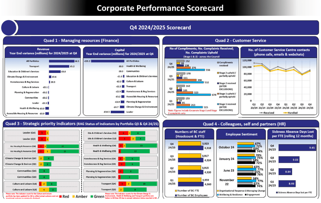 The Corporate Performance Scorecard was developed as a reporting framework for a local authority. It straightforwardly represented key metrics to illustrate the authority’s performance each quarter. The process involved gathering requirements and building stakeholder consensus to identify the essential data points the authority needed to measure and report. This data aimed to provide a balanced view of the organisation’s overall health. Key items included financial metrics (such as revenue and capital expenditure variances), priority Key Performance Indicator (KPI) statuses categorised as Red, Amber, or Green, as well as information on complaints and compliments, customer contacts received and handled, and workforce metrics such as headcount and sickness rates.